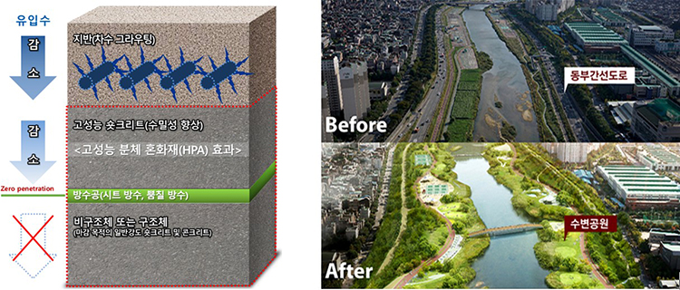 [사진 자료: (좌) 고성능 숏크리트 기술 개요(실크로드티앤디 제공) / (우) 동부간선도로 지하화 개념도(서울시 자료)]