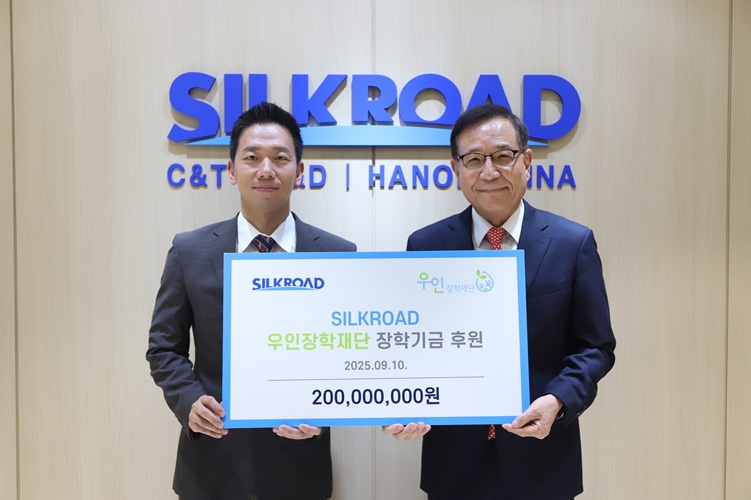 SILKROAD는 9월 10일(화) 진행된 창립 42주년 기념 ‘걸음 기부 캠페인’ 목표 달성에 맞춰 우인장학재단에 장학기금 2억 원을 전달했다. SILKROAD는 2018년부터 재단에 정기적으로 장학금을 후원하며 인재 양성을 위한 사회공헌 활동을 이어오고 있다.